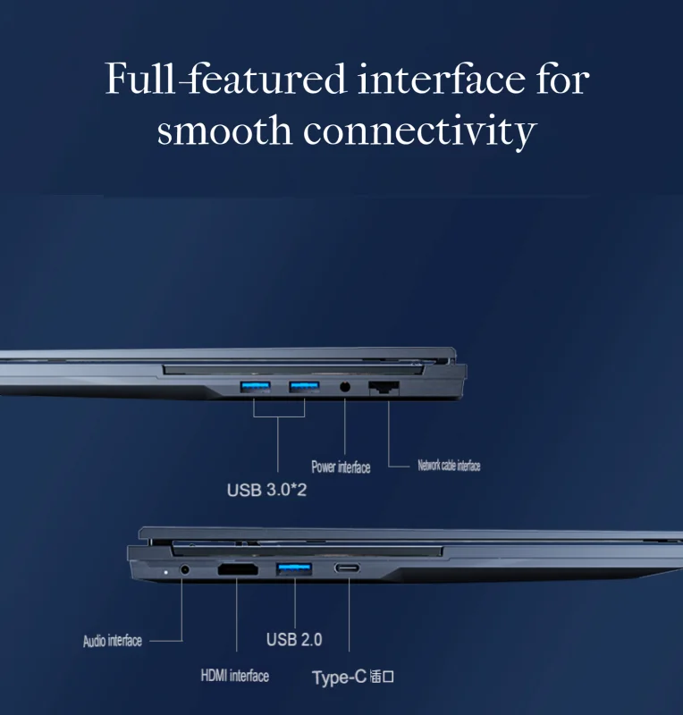 The Zouiks laptop boasts a slim, metal body that combines elegance with durability. Its precision craftsmanship and diamond-cut edges give it a premium look and feel, making it both stylish and robust. This sleek design not only enhances its visual appeal but also ensures a lightweight and portable device that’s easy to carry.